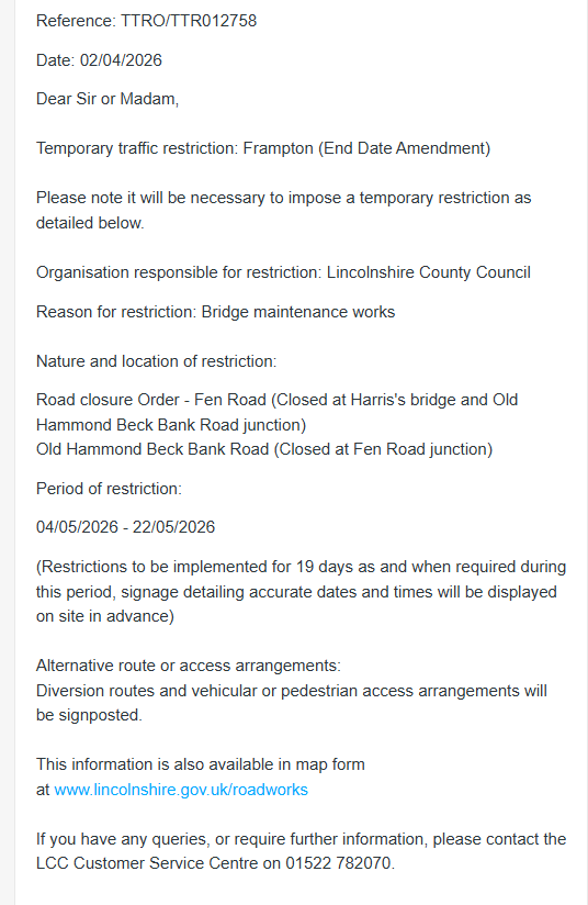 Fen & Old Hammond Beck Bank Rds 13/04/26-22/05/26